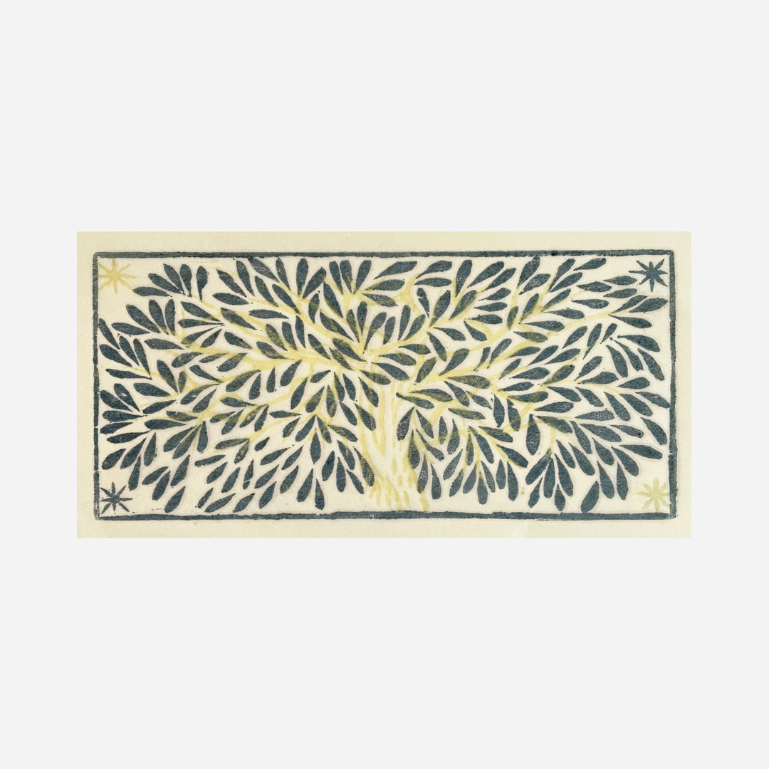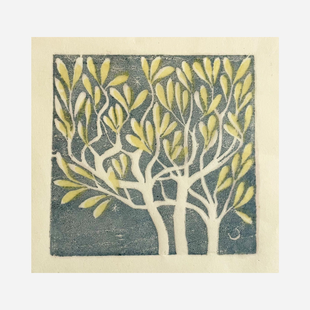 Top Left: Grace Sharp, Flowers From Home, Main: Yuliia Syrenkova, Tree Ladder (detail), Bottom: Maura Hawkes, Almond Trees with Stars.