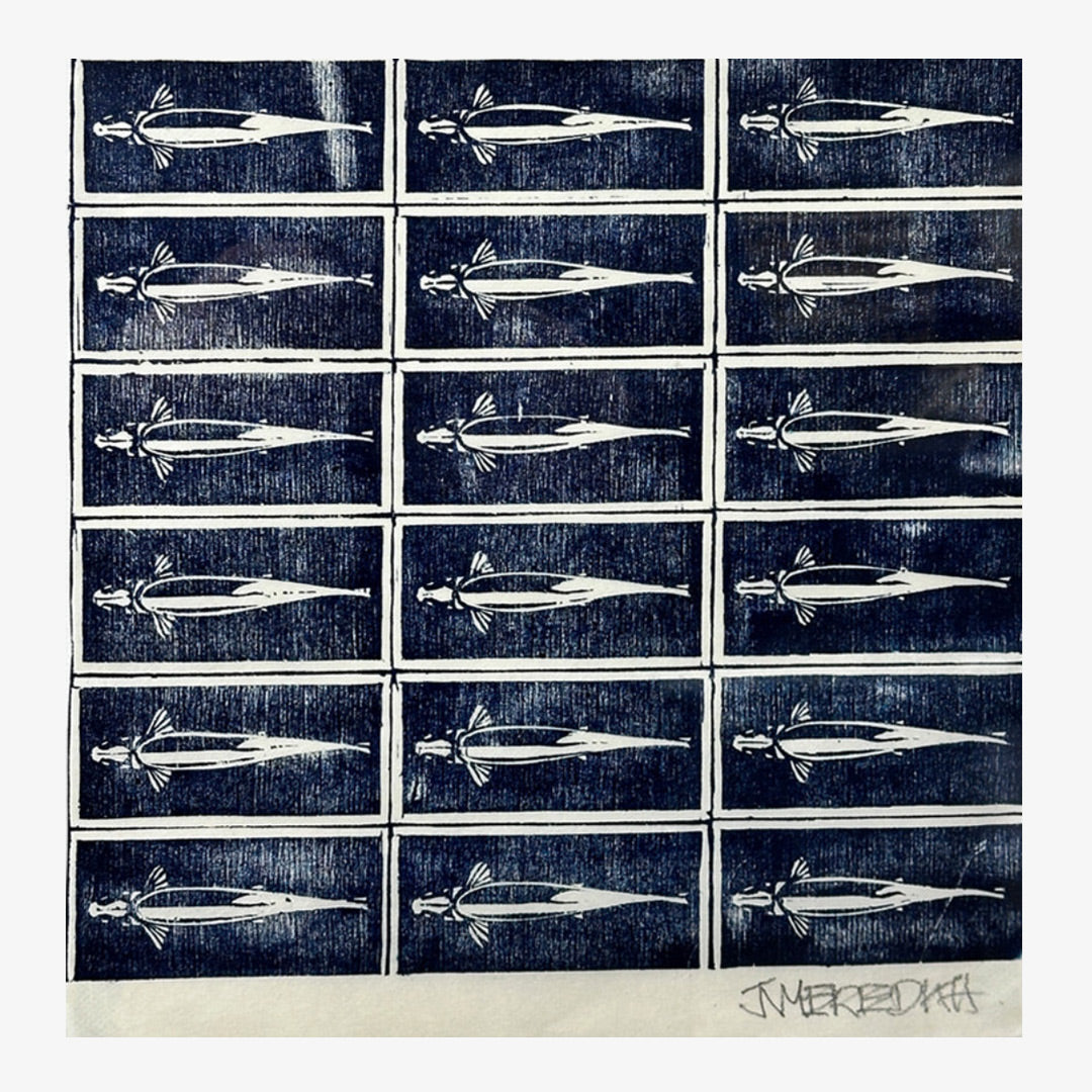 Julian Meredith’s work is well known for the prussian blue colour he often uses – his work, like Eriko and Hiroyuki’s, is inspired by and concerned with nature – his prints often depict endangered species of fish, birds and mammals. He did a series of ‘Fish Trap’ prints during a residency at Northern Print on Fish Quay and displayed these in the now-demolished lifeboat station in North Shields. He has since created a life-sized woodcut of a blue whale during a residency in the Great Hall, Discovery Museum as part of International Print Biennale.