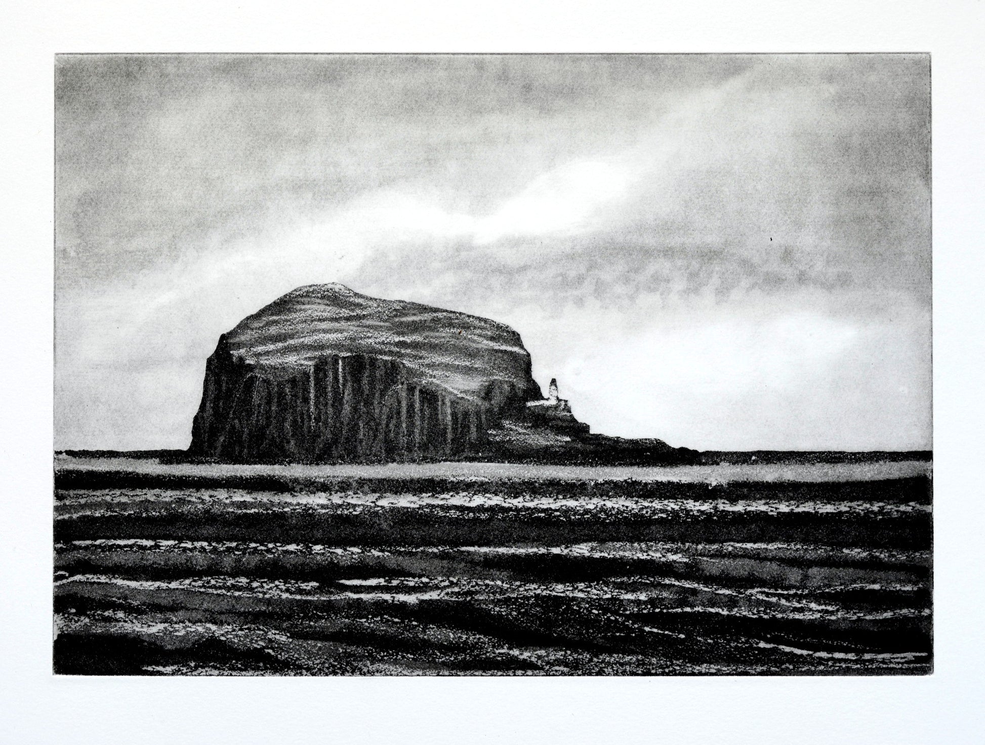 A view of the Bass Rock from North Berwick. Aquatint and spit bite etching on Somerset satin paper.