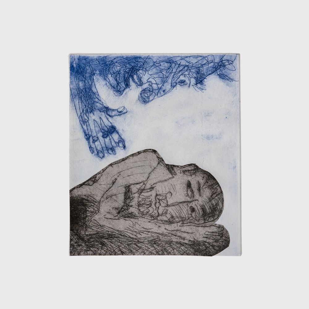 This suite of etchings by Kevin Petrie is partly inspired by Iris Murdoch’s 1969 novel ‘Bruno’s Dream’ where an elderly man reflects on his life and enthusiasms, like stamps and spiders, while trying to reconcile aspects of his life and to reconnect with his estranged son. Along the way various people connect with and support him.