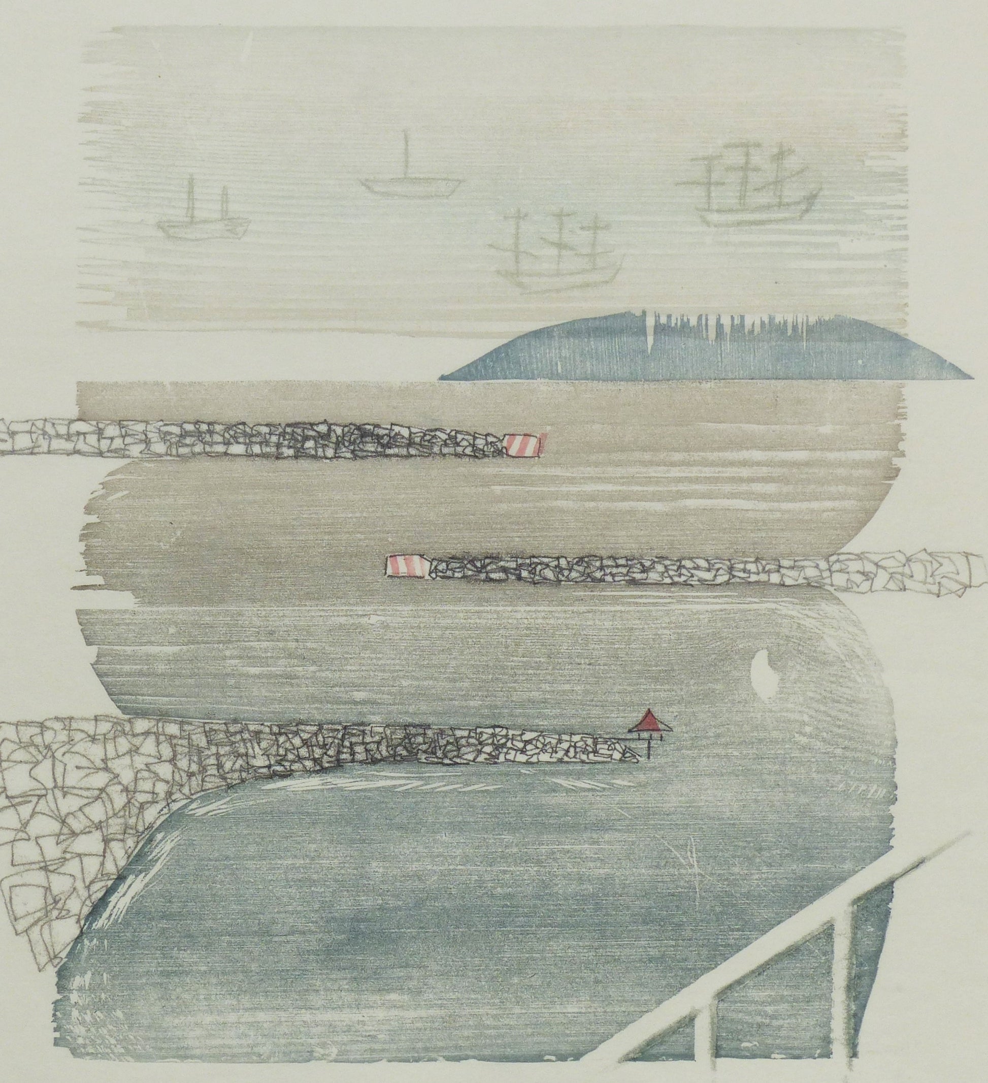 Printed from 2 blocks with monoprint drawing and rubber stamp, with oil based ink on Kozo paper.