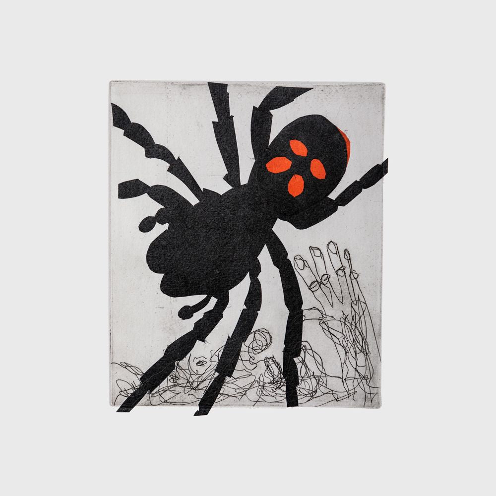 This suite of etchings by Kevin Petrie is partly inspired by Iris Murdoch’s 1969 novel ‘Bruno’s Dream’ where an elderly man reflects on his life and enthusiasms, like stamps and spiders, while trying to reconcile aspects of his life and to reconnect with his estranged son. Along the way various people connect with and support him.