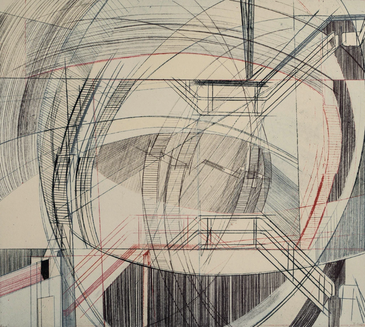Sleigh’s work asks questions about the built environment. Through drawing, she investigates attitudes to space as expressed through architecture and its relationship to the landscape.