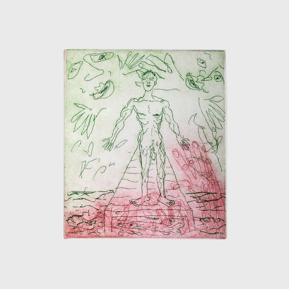 Kevin made two etchings of a recumbent ‘Bruno-like’ figure at a one-day Northern Print etching workshop. From this he developed several plates with various combinations and collaged (chine collé) additions over the next year. Some plates relating to other Murdoch novels and images are sometimes over printed to create ‘other stories’.