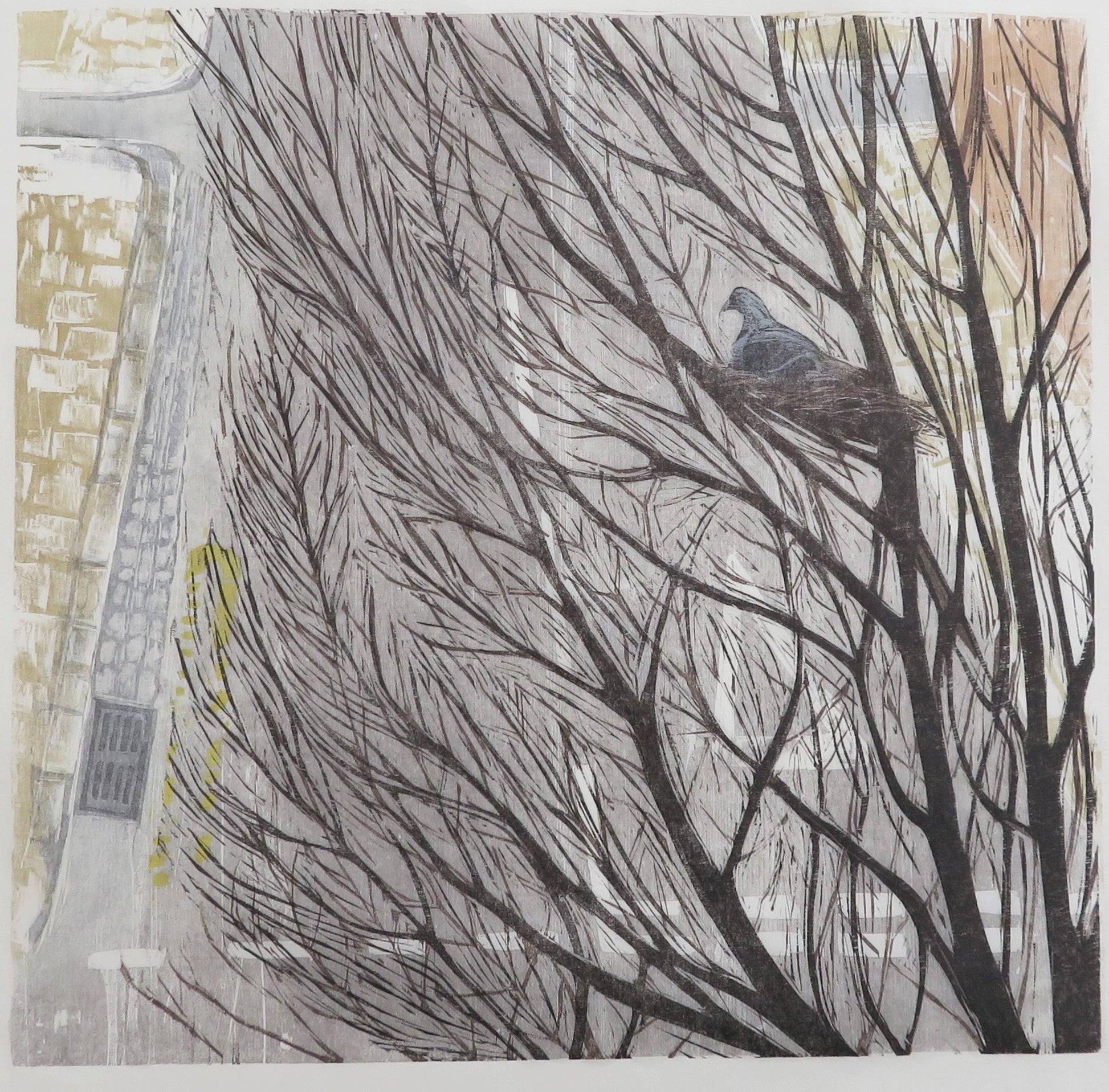 Much of Joanna Bourne's inspiration for her prints comes from her local area of Newcastle with its town moor and parks and her allotment and garden. She is interested in the places where urban life and the natural world meet, and her images convey the impressions of a given moment in time, a scene glimpsed which has resonated with her, initially working from drawings, photographs and memory. She responds in particular to the atmospheric incarnations of ‘northern’ weather – wind, snow and rain, and the changing times of the year.
