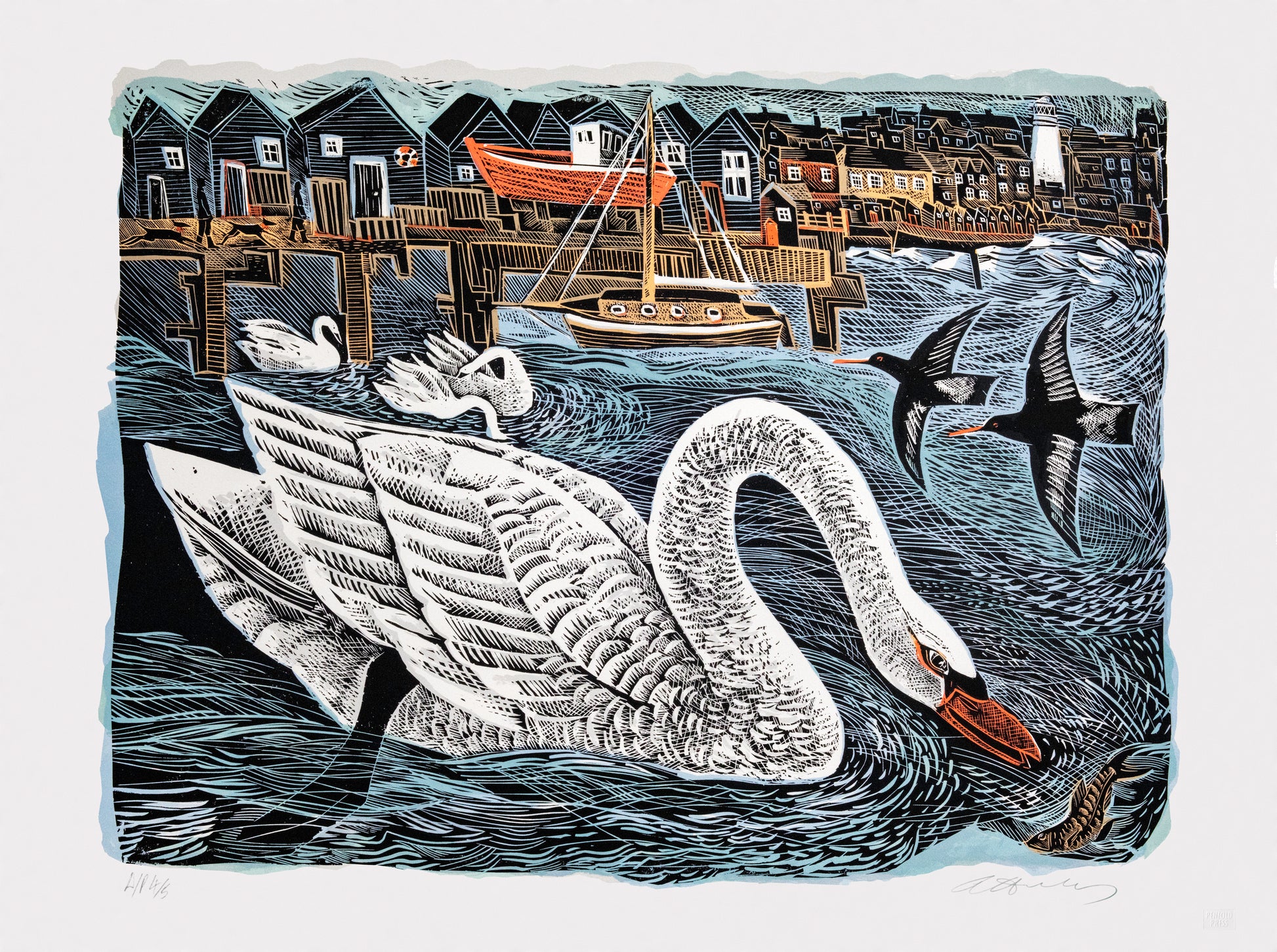 "Southwold has been a place I have loved to visit for many years. We took the children there as they were growing up and we are now lucky enough to stay there in the summer in our own boat. The town is full of charm but it is the Harbour I love most. In this print I have tried to depict the atmosphere and character of being there. In the background you can see Mark and I striding along towards Windsong our boat, mourned up and surrounded by swans."