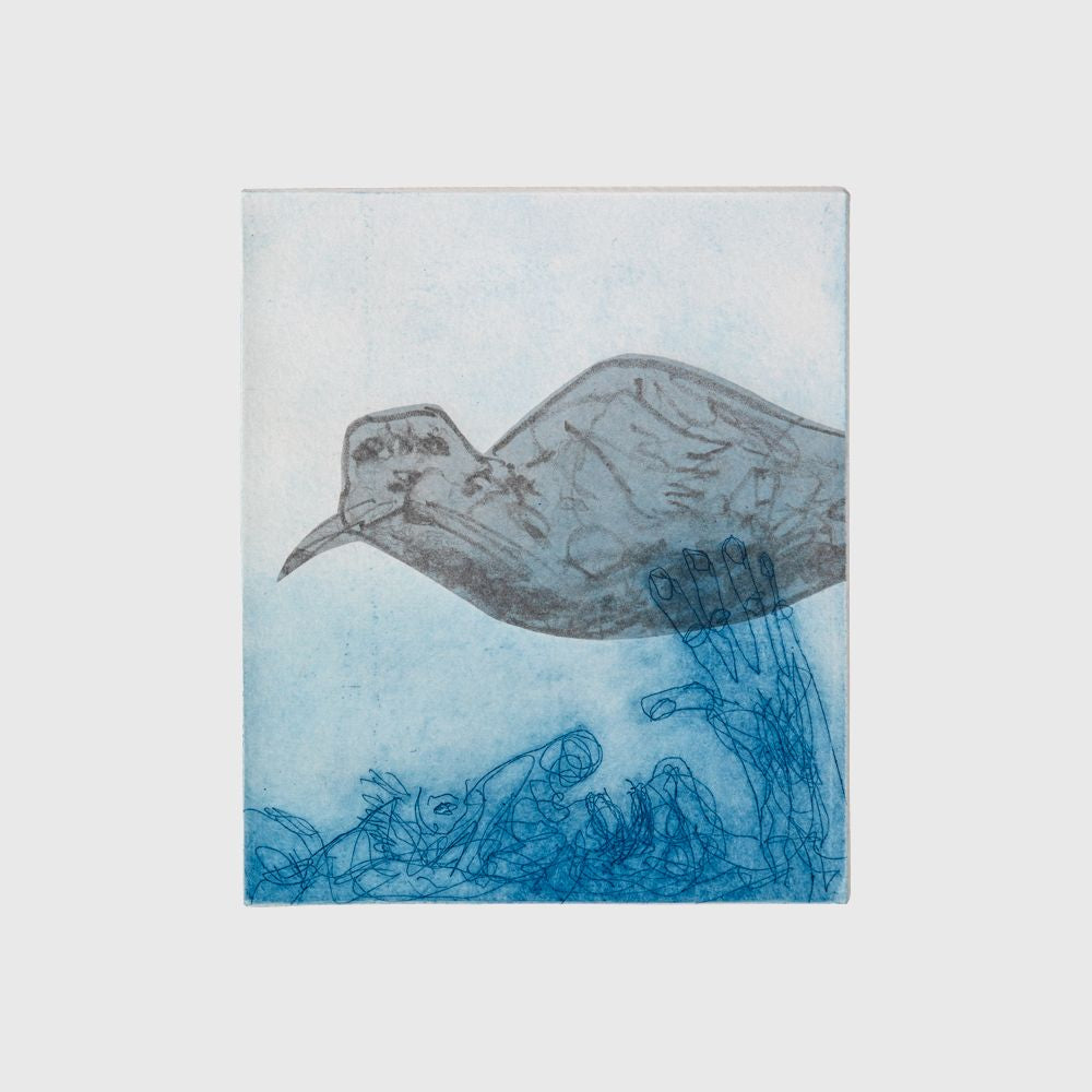 This suite of etchings by Kevin Petrie is partly inspired by Iris Murdoch’s 1969 novel ‘Bruno’s Dream’ where an elderly man reflects on his life and enthusiasms, like stamps and spiders, while trying to reconcile aspects of his life and to reconnect with his estranged son. Along the way various people connect with and support him.