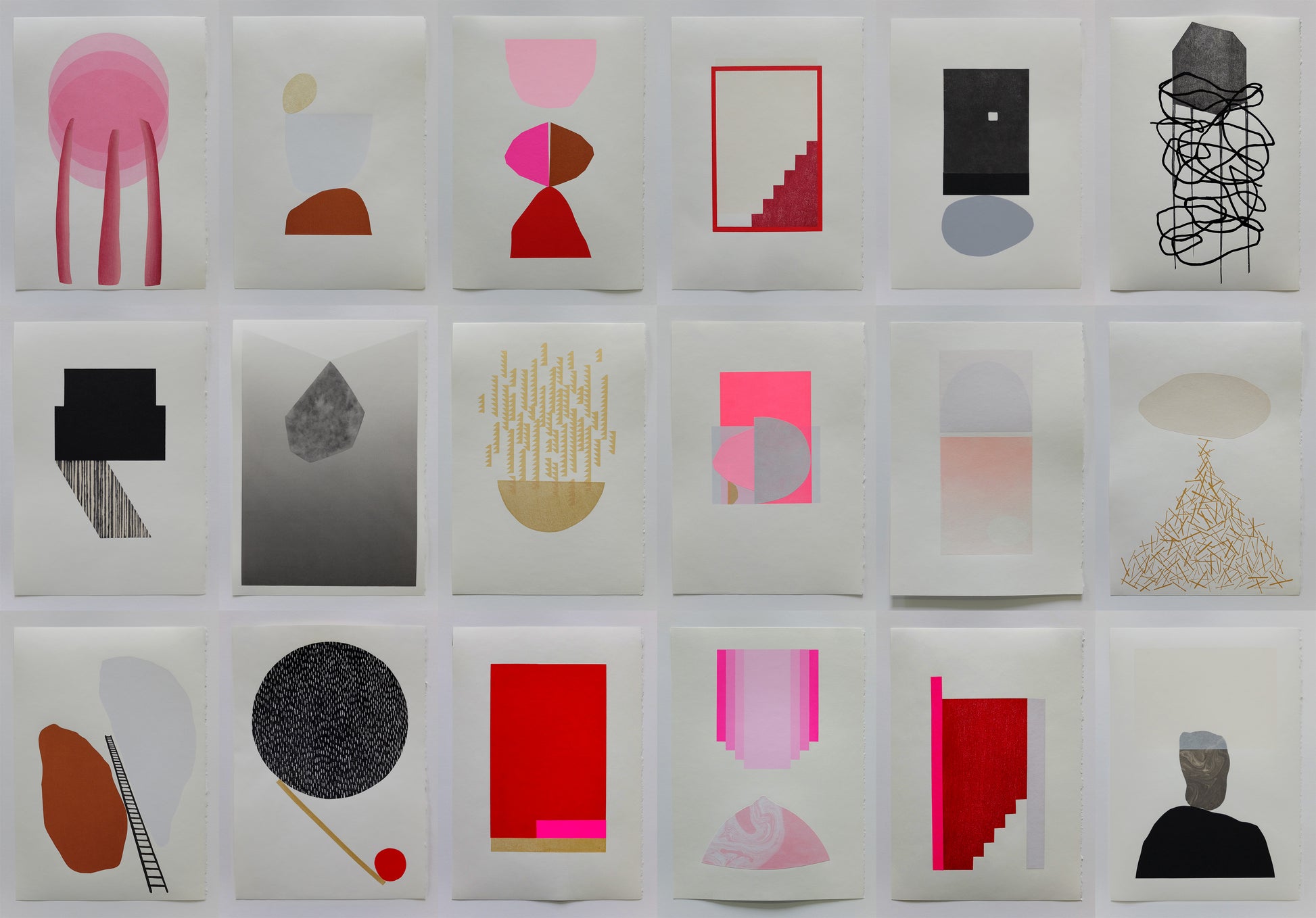 A collaboration with French-Canadian artist Guillaume Brisson-Darveau, a dialogue in print using mokuhanga. Silkscreen and collage. Printed at Kala Art Institute, California, 2016.